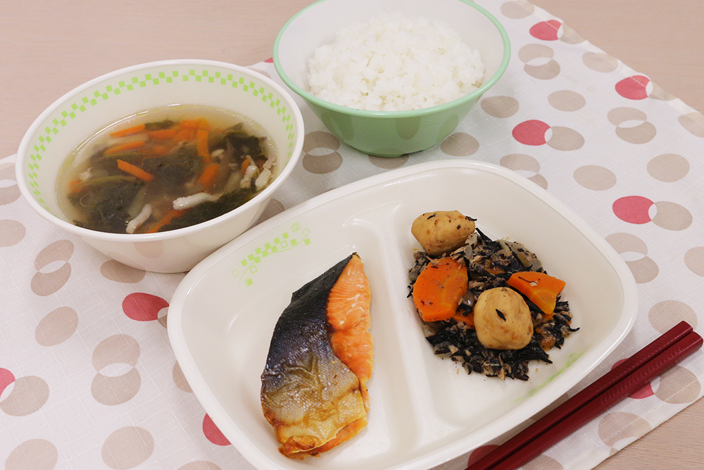 主食(ごはん)、副食(3品程度のおかずや汁物)を食缶方式で配膳。